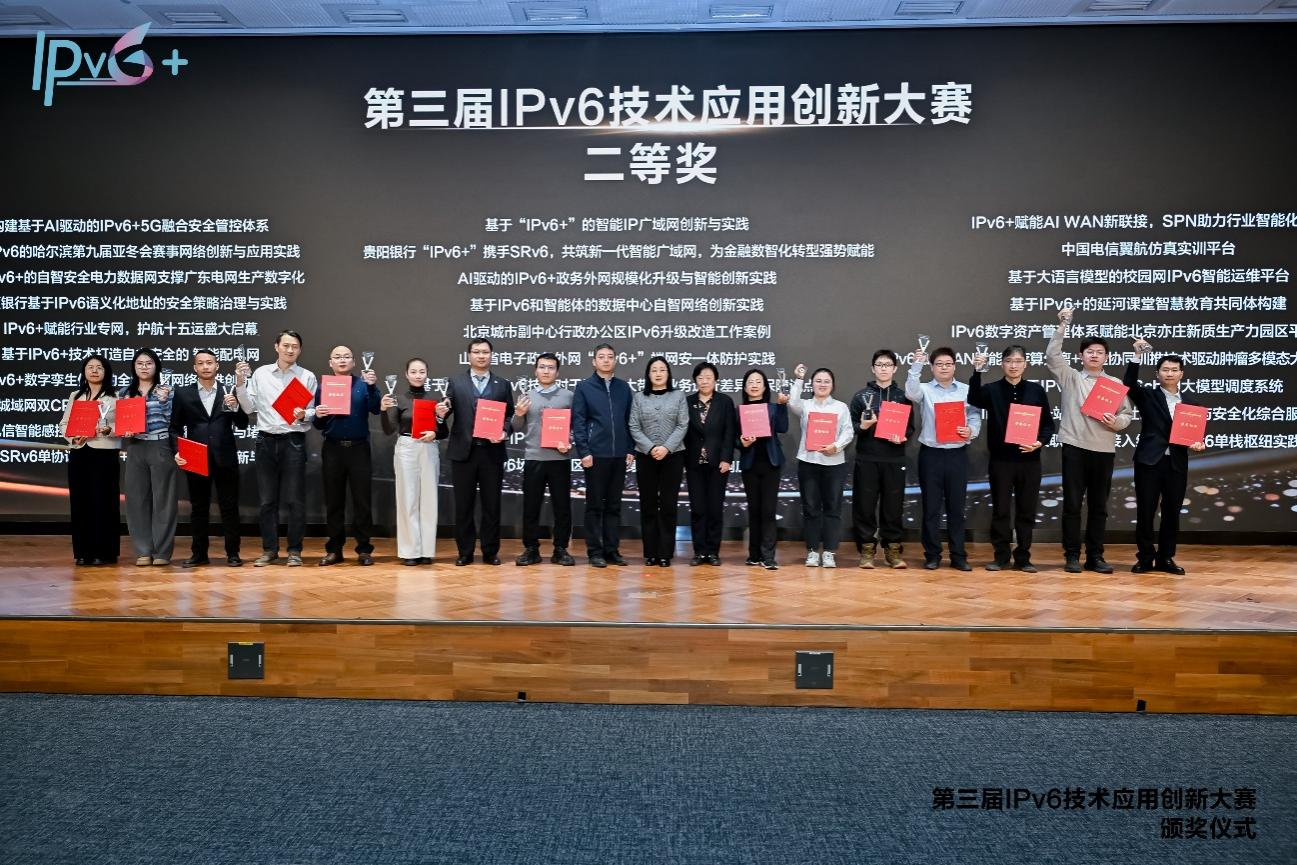 2025年12月27日,第三届“IPv6技术应用创新大赛”总决赛颁奖仪式在北京举行。本届大赛以“深融共进 智启新篇”为主题,由中国信息通信研究院、中国通信标准化协会联合主办,中国信息通信研究院、中国电机工程学会、中国教育和科研计算机网CERNET网络中心、常州大学等单位分别主办了强基、电力、科教、油气、金融、AI WAN、自智网络等7个专题赛。